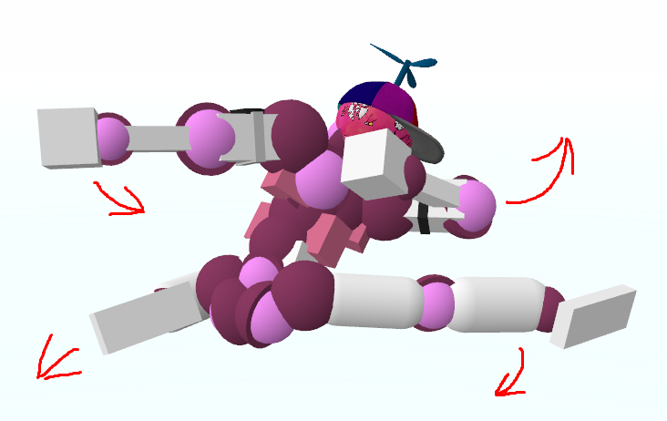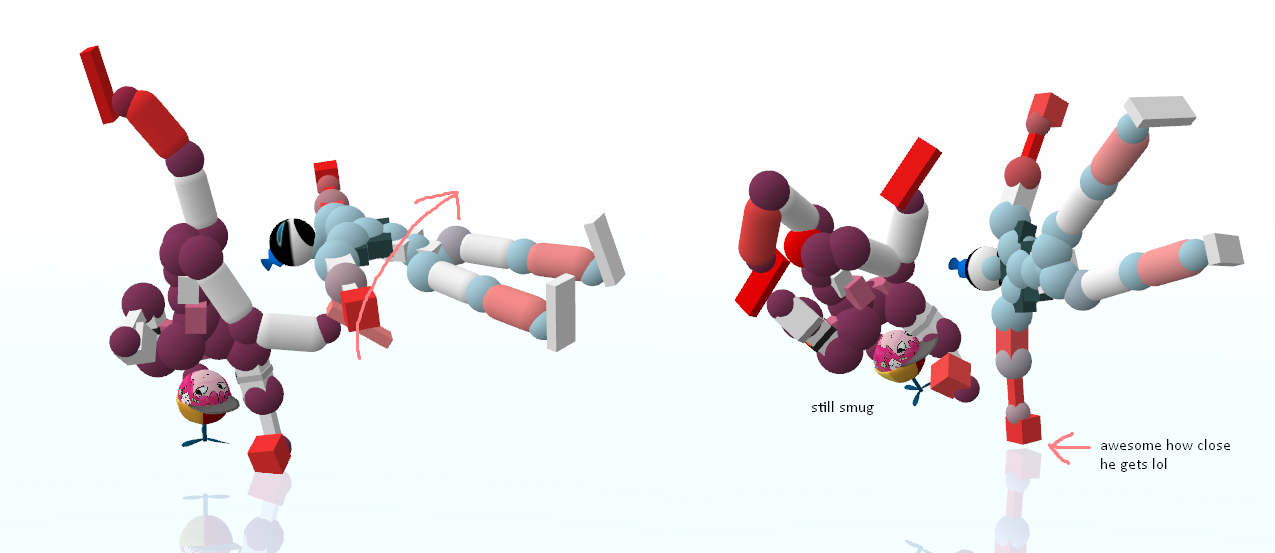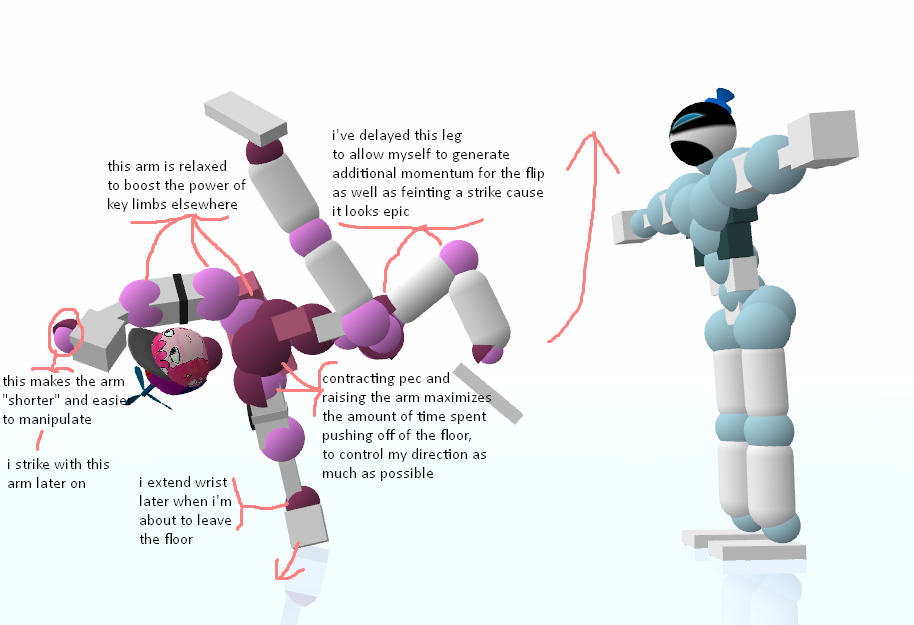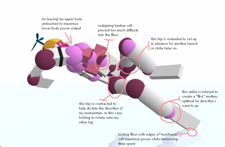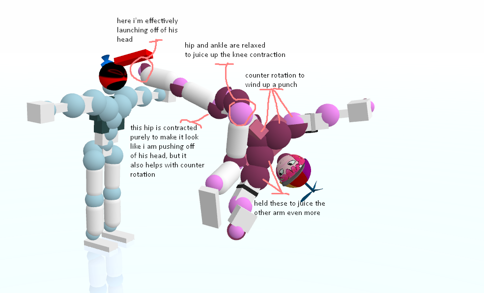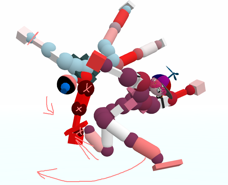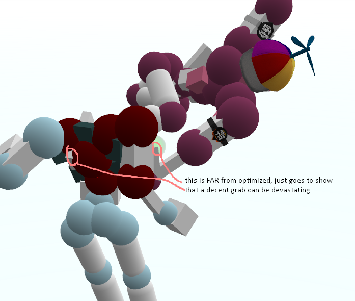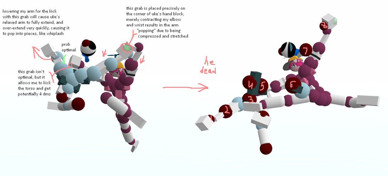 Okay okay, I hear you. All this rambling about grabs, boomhits, and movement, and you still have no fucking clue how to just simply break a joint and move on. I got you. Let's say you're currently spinning and really want a simple dismemberment. Your first instinct, obviously, is to kick and punch at whatever joint(s) you're trying to break as hard as you physically can. You might succeed in getting the dismemberment, but you'll quickly find the replay hard to continue due to all of your momentum being sucked up by a single pec DM and you're forced to wait for a good position. Does this sound familiar? Have a look at this: