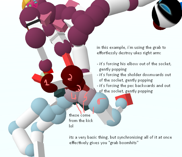 Alright you've done your manip, now you'll probably be struggling with how the hell you stop this train. It's fairly simple actually, just by using pretty much any of the techniques we previously talked about you can quite easily begin a chain of dismemberments. You can start off by chipping off a wrist joint or something, or fully clip your foot inside his hand and stretch his entire arm off, etc. You can also go directly into a boomhit if you want, which will be made easier by uke's rotation.