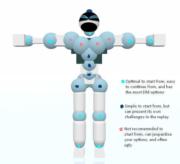 The torso and hip area is a little more tricky, at this point you'll be separating Uke in two, making it challenging to focus on both halves while still looking good. On higher gravities these types of DMs can be somewhat tedious, as Uke will fall quite quickly making the replay a bit boring if he's left lying on the ground for long periods. For the hips specifically, while they're easy, it does remove the potential for a crotch boomhit later as well as the knee DMs in most cases, so it